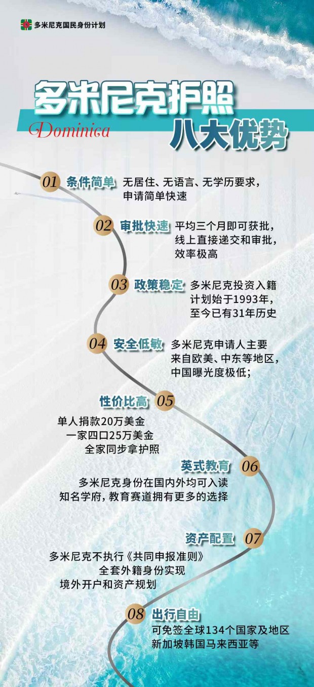 多米尼克投资公民计划始于1993年,由《多米尼克国宪法》制定。为了促进该计划的发展,多米尼克总理在2014年10月宣布修订及完善有关立法。项目为申请人提供众多便利条件:审理时间短,可拥有双重国籍,免签访问119个国家,如英国、新加坡等国家,并且免签申根国家,让世界范围内的旅行变得更方便。多米尼克首都为罗索,官方语言为英语,人口7万人